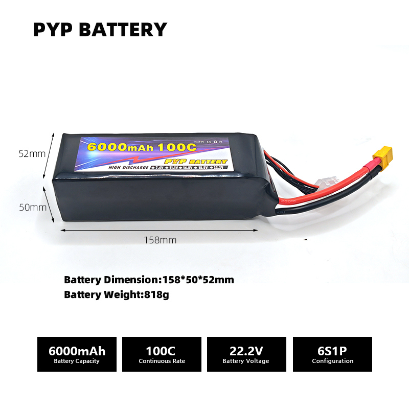 6000mAh 6S 22.2V 100C Discharge rate: 100C Volage: 22.2V Dimension: 158*50*52mm Weight: 818g Connectors: XT90-S/XT60/EC5 etc. |